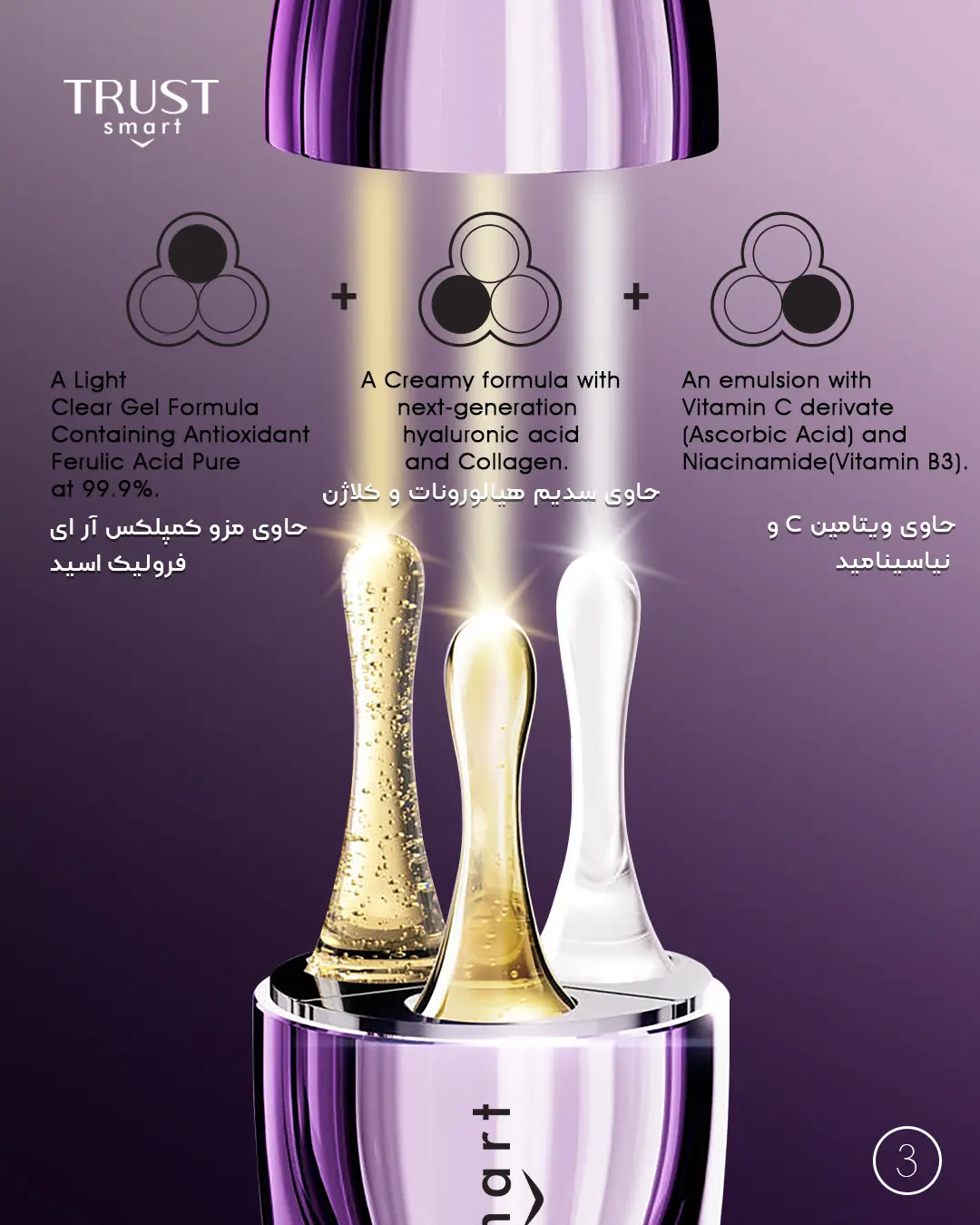 سرم فرولیک اسید، کمپلکس مزو، سرم کلاژن، هیالورونیک اسید، سرم ویتامین سی، نیاسینامید: 60ml